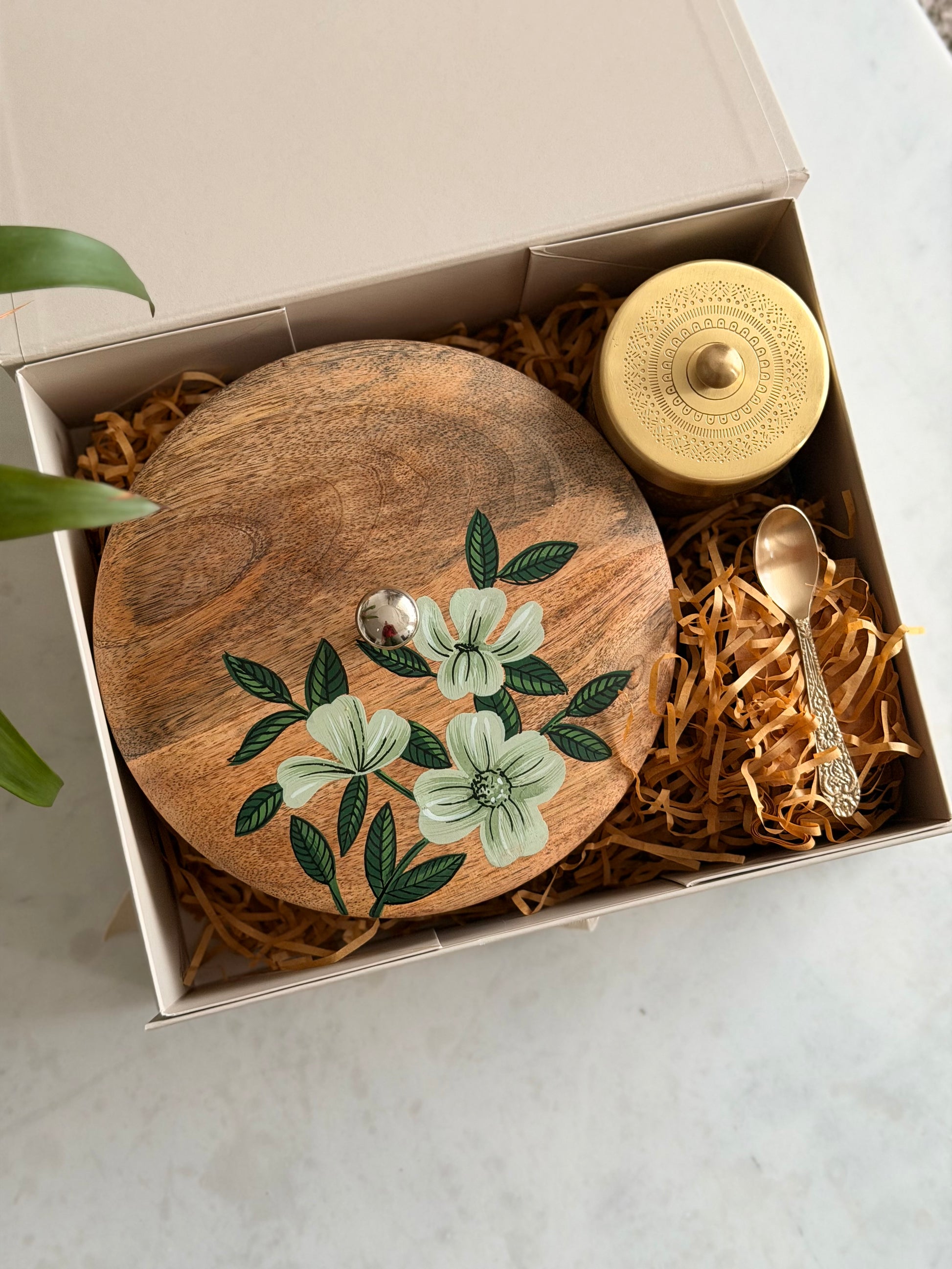 A classic pairing for the heart of the home - kitchen aka Rasoi. This bundle features the Handpainted Roti Box and a coordinating small brass bar with spoon to store and serve ghee. A perfect way to blend traditional utility with modern, artisan charm.